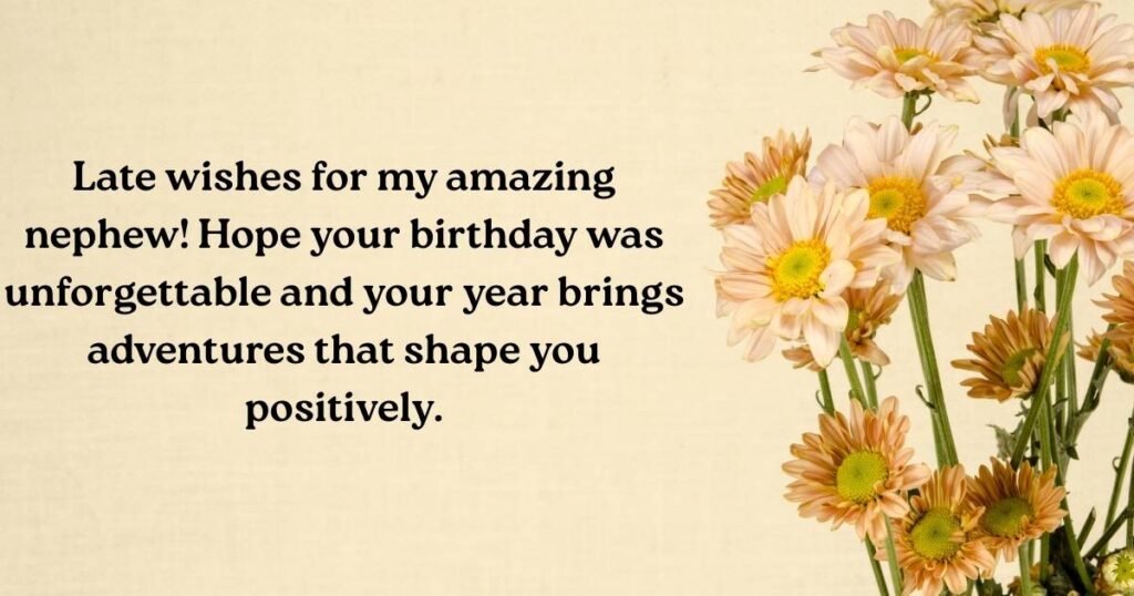 - Late but sincere wishes for my special nephew! May your year ahead overflow with adventures, friendships, and dreams realized.