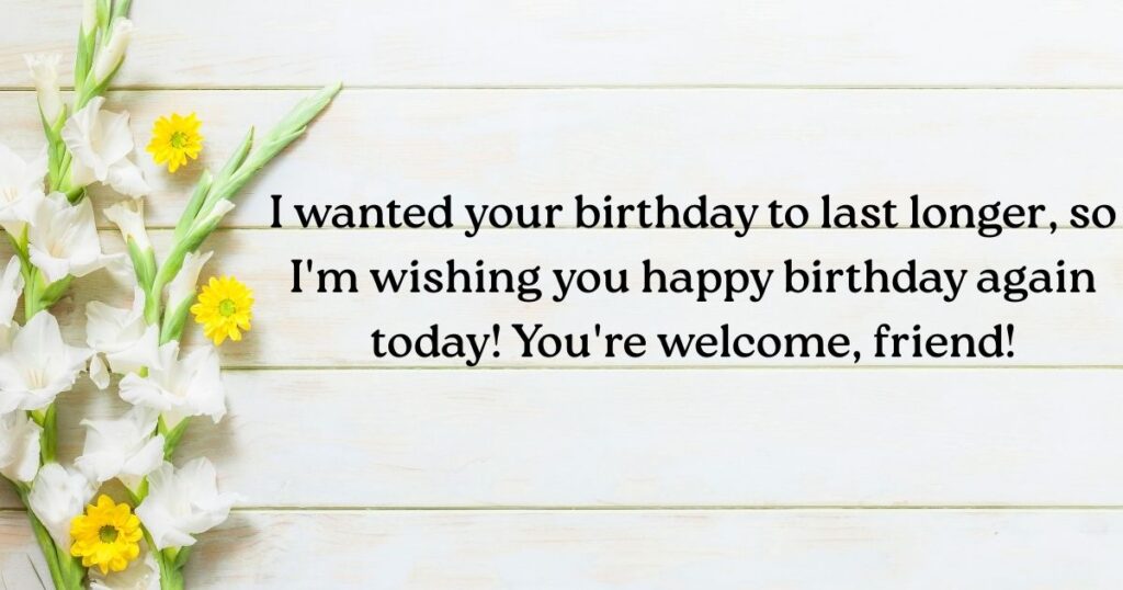 - I wanted your birthday to last longer, so I’m wishing you happy birthday again today! You’re welcome, friend!